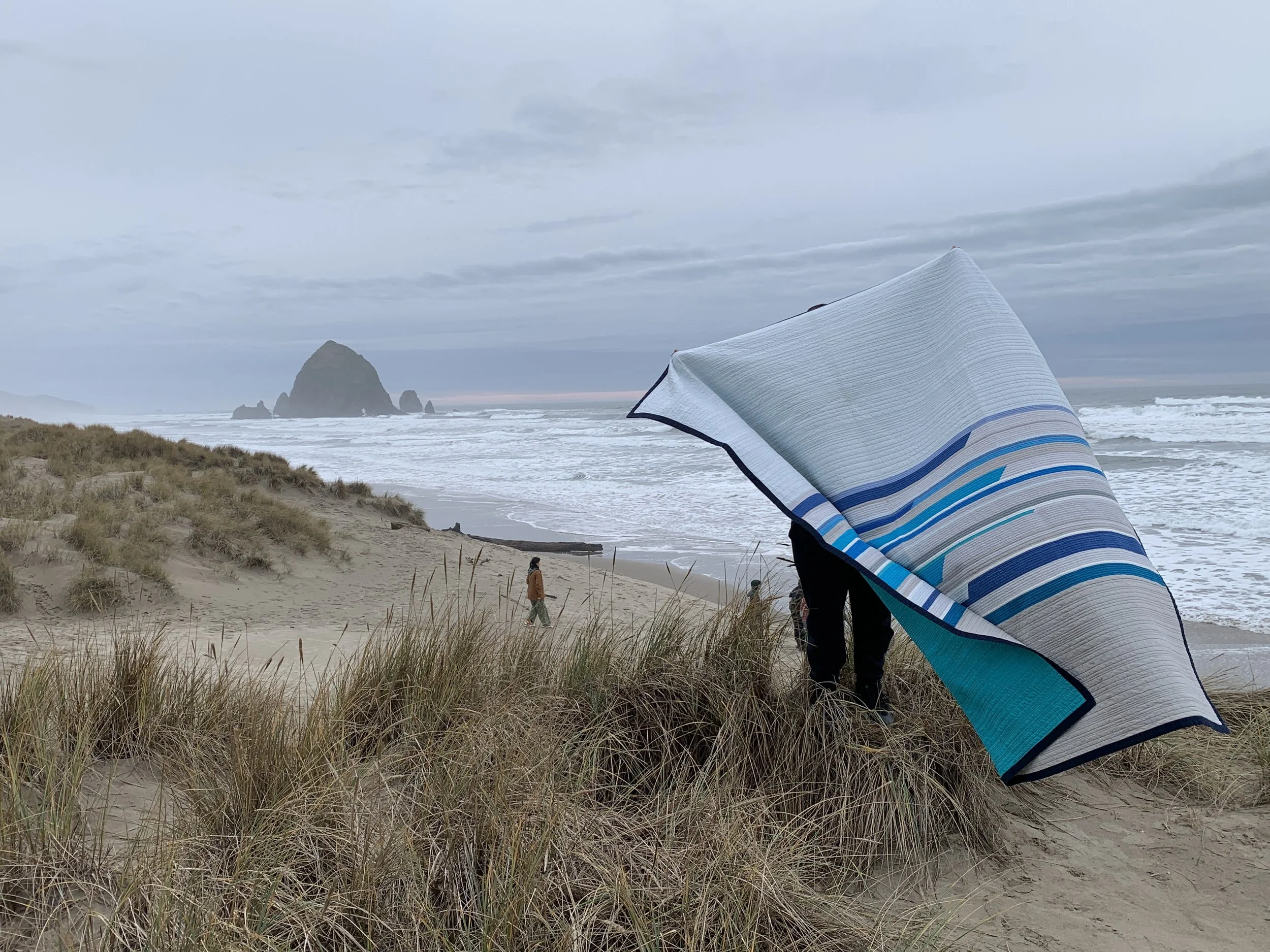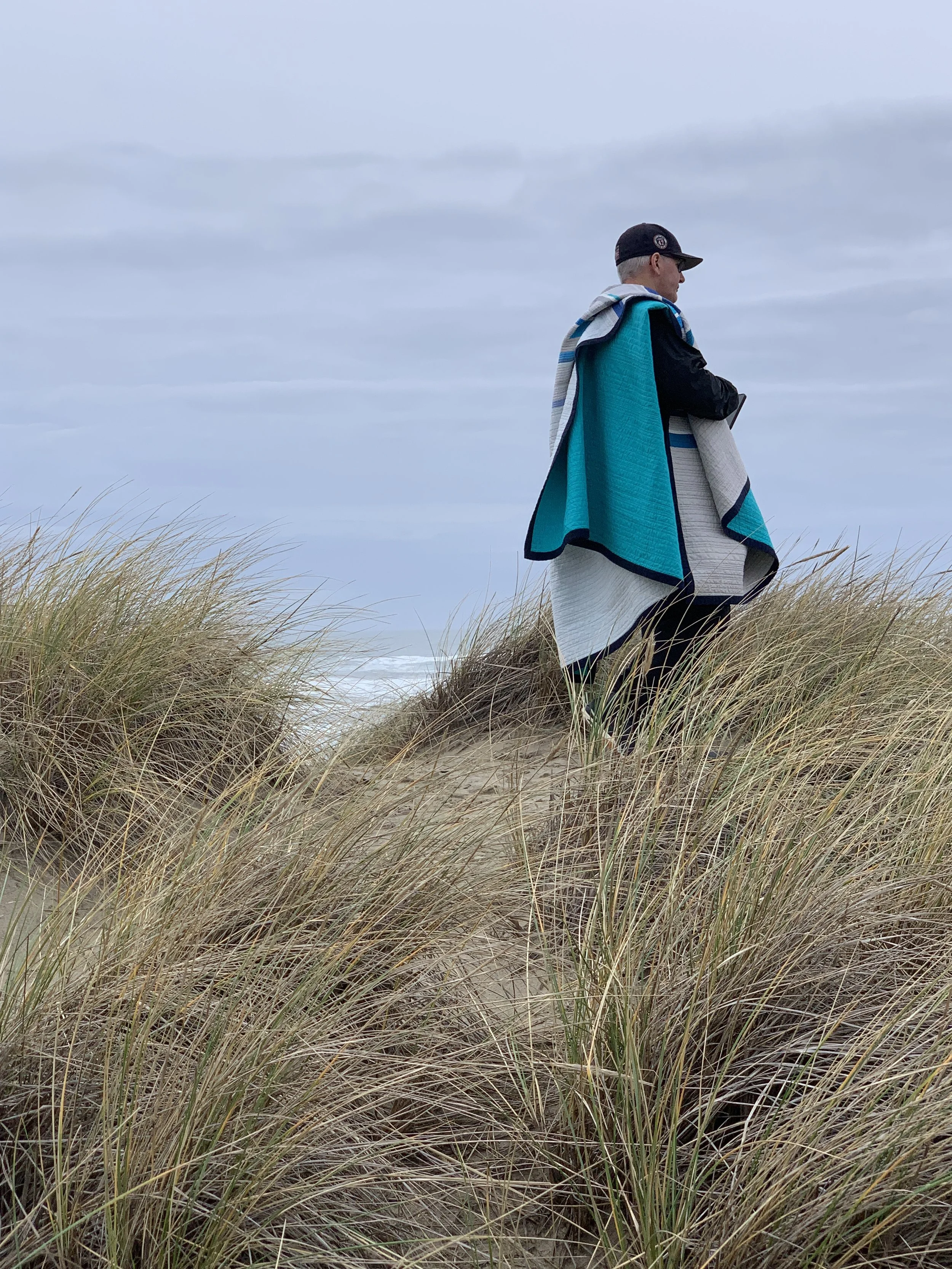 Inspired by the cold waters off Oregon’s north coast, Dana began his original design by creating a cool color palette from Kona Cotton solids. He chose a collection of turquoises and soft blues, setting this against light neutrals of similar value. These color combinations, along with the angular geometry, create a modern representation of sand, sea, and sky.